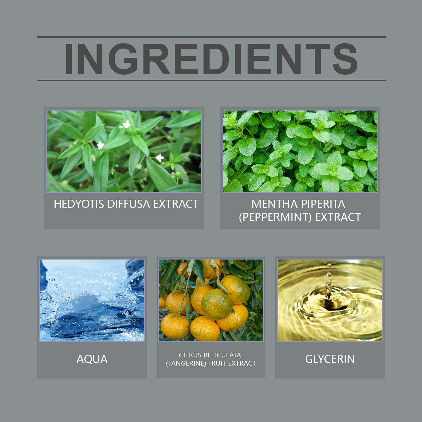 Ingredients: Water, White Flower snake tongue grass extract, Mint leaf extract, citrus extract, glycerin