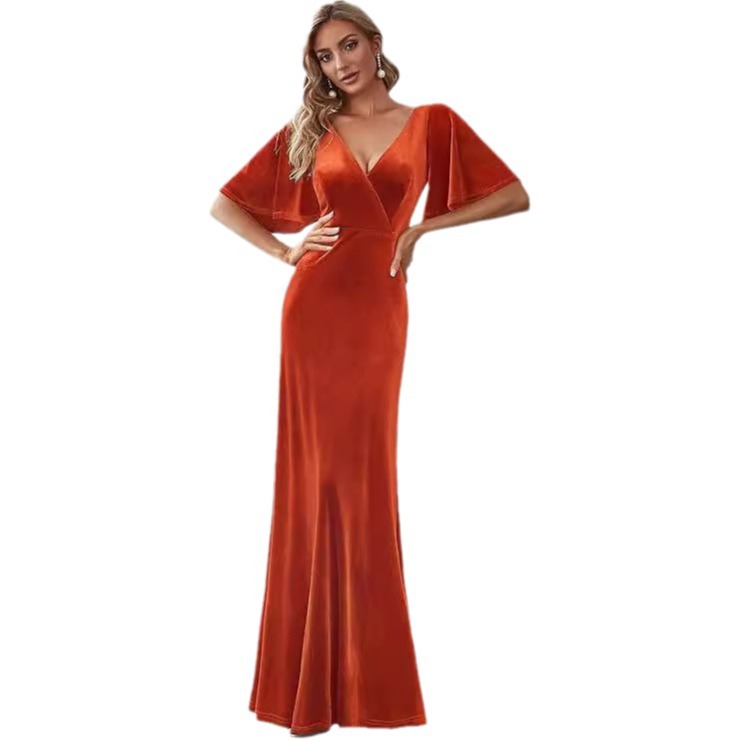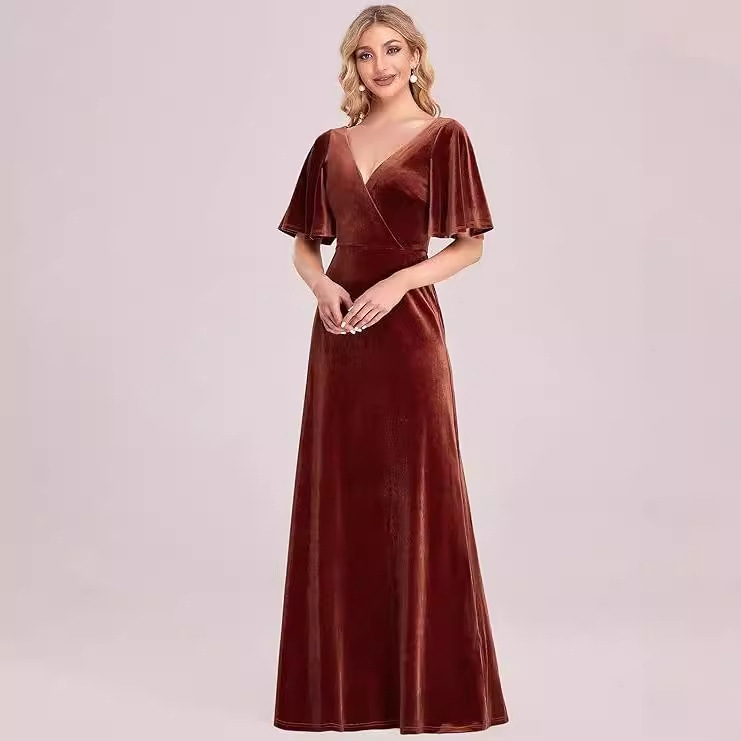 Elegant Bridesmaid Cocktail Party Banquet V-neck Velvet Evening Dress