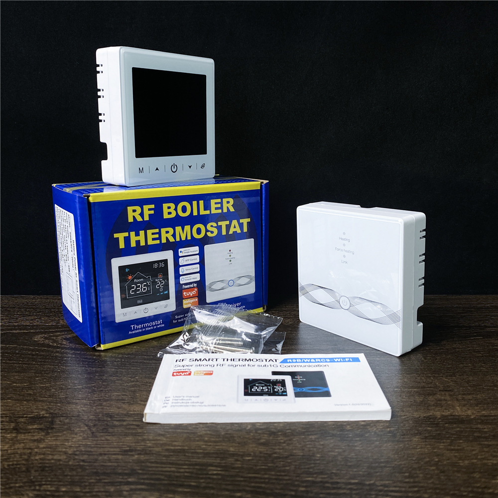 This set is suitable for wall-mounted furnace temperature control. As long as you install the RF receiving device in the wall-mounted furnace attachment, the RF thermostat can be placed in the living room or room (100 meters away from the open space), you can control the RF receiver through the RF thermostat.
