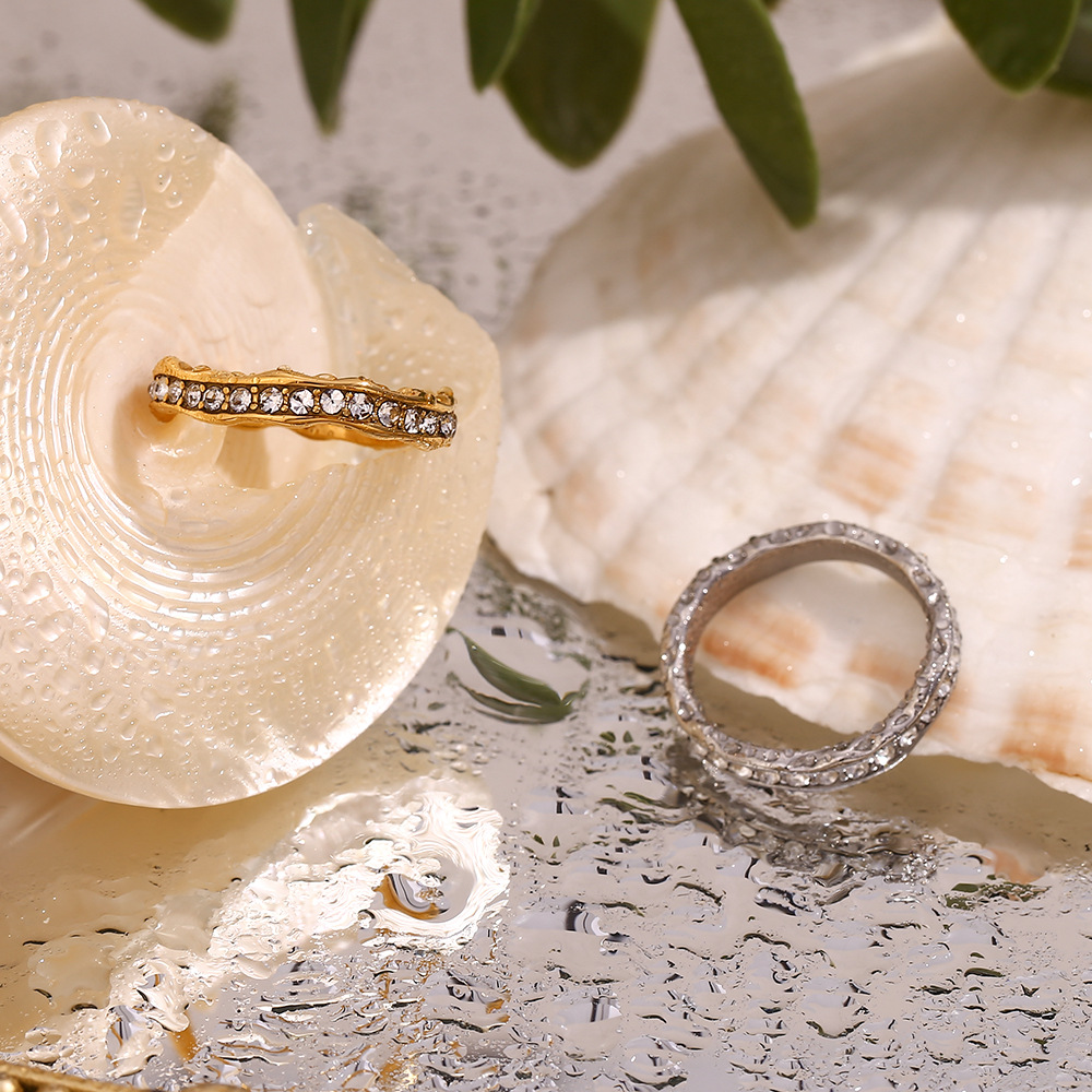 Stainless Steel 18K Gold Plating Irregular Wave Pattern Full Diamond Ring